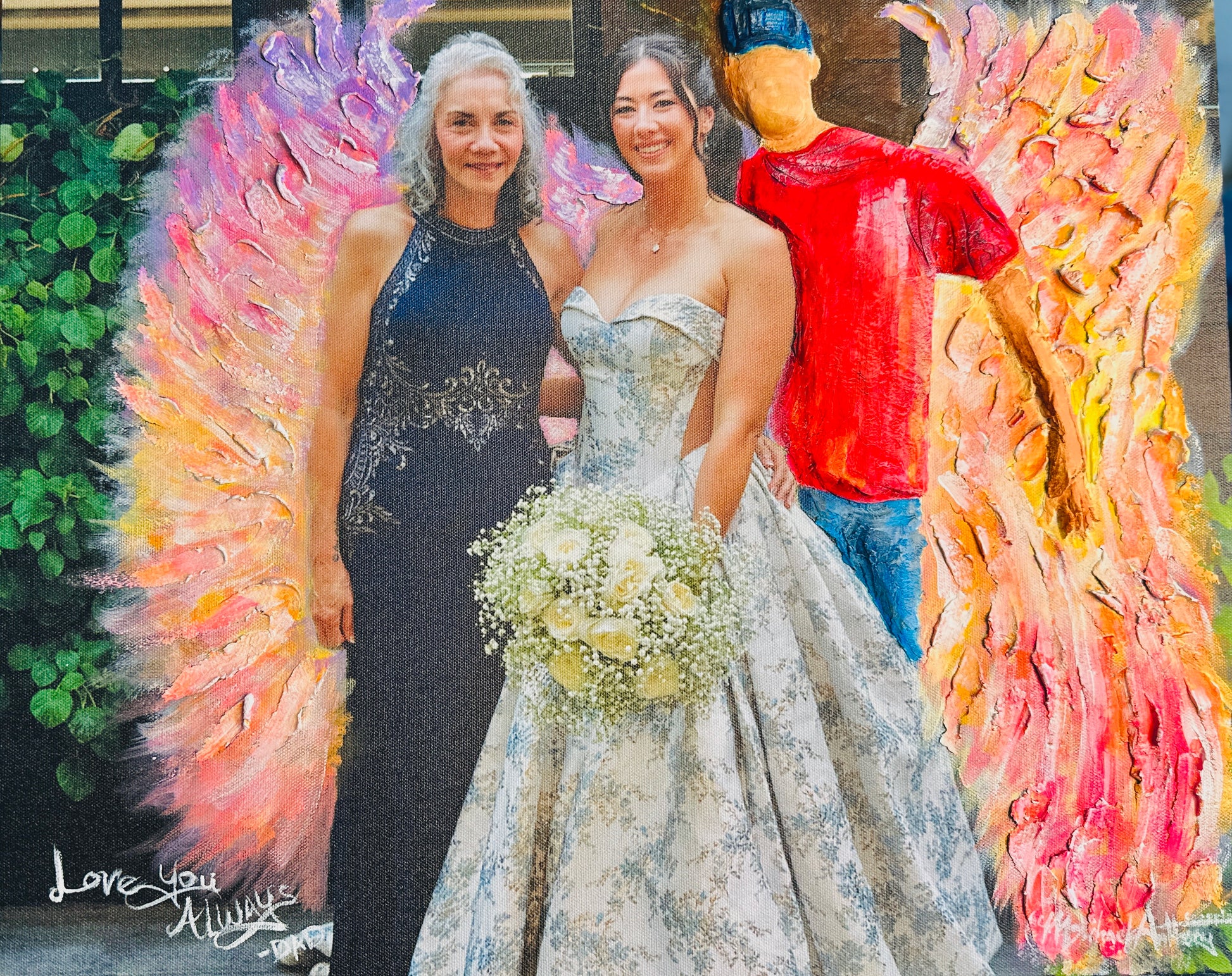 Created as a custom angel memorial painting from a wedding photograph, this piece honors the enduring bond between a parent and child, even beyond physical life. It serves as a reminder that love never leaves — it transforms, protects, and remains present.