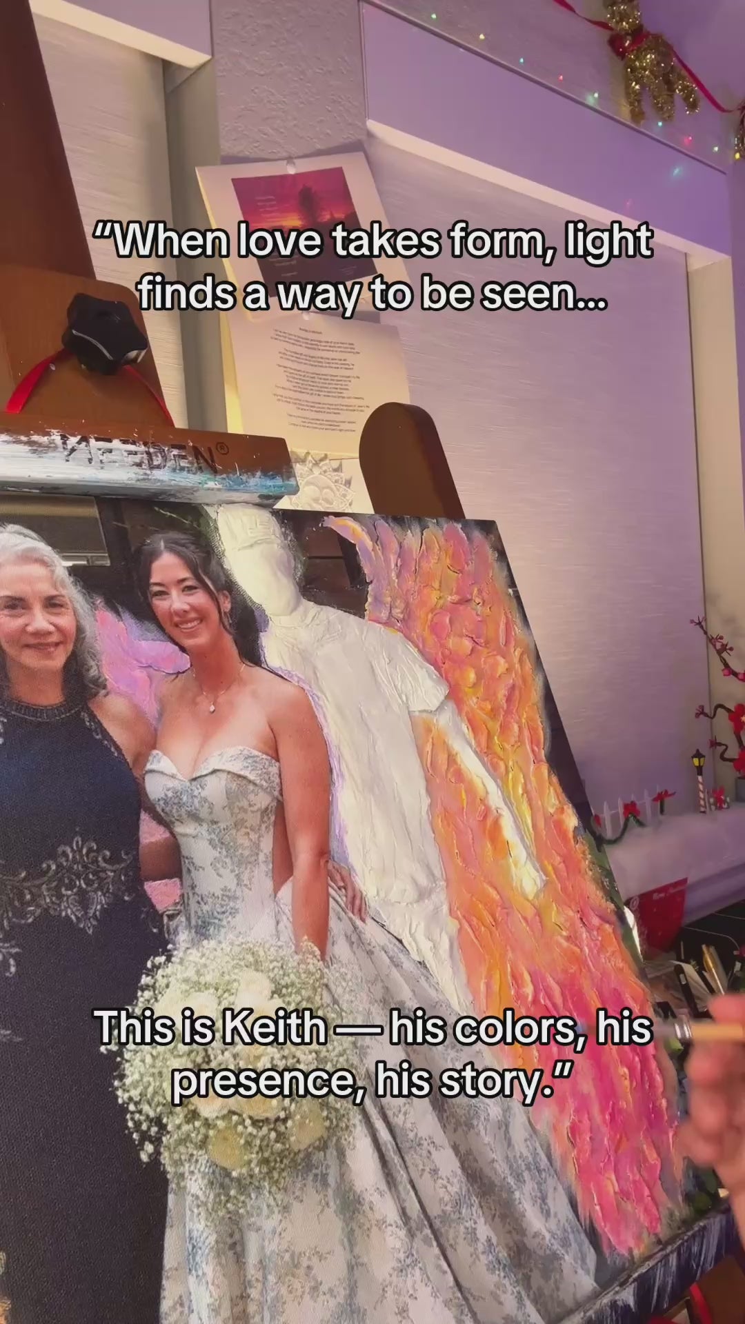 “I had been admiring your artwork since the first time I saw you on TikTok. I was inspired to commission you for a very personal piece for my daughter for Christmas. My husband passed in Dec 2023 and it’s been very hard on all of us. I wanted his angel painted on a photo from my daughter’s recent wedding. Michael Anthony not only created a beautiful piece that my daughter will cherish for many years, but it was obvious that there was much spiritual energy and thoughtfulness that went into the artwork you created. When I presented it to my daughter, she was shocked but in a good way. Tears were overflowing for us both and we could feel his presence with us. It was exactly what I was hoping for. Thank you Michael Anthony for taking so much care in this amazing creation you did for us! I am already thinking about commissioning you again for a special piece for myself! Never stop giving us your beautiful angels!!!”